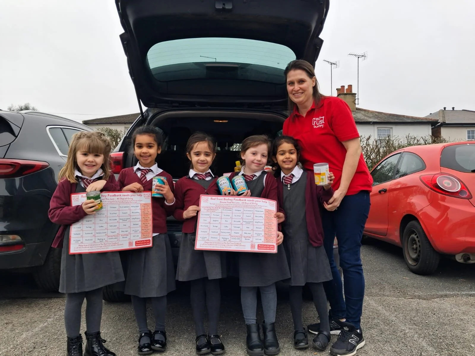 The Pupils from Year 1 at Bushey Heath Primary School helping Miriam load the car with all their 2026 Lent Drive donations for the foodbank.